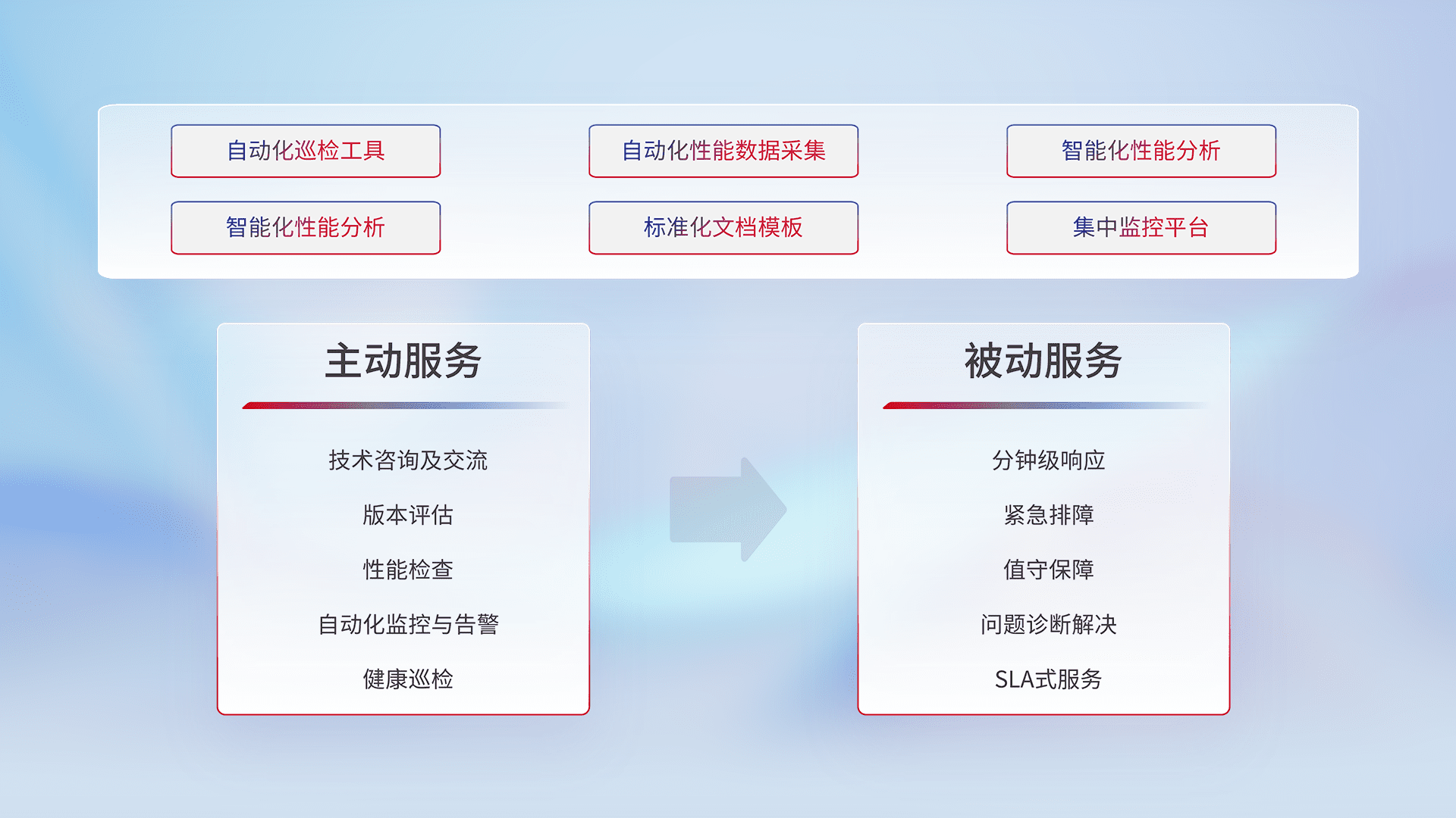 智能化工具和标准化文档,,,,保障服务质量,,,提供主动服务(包含技术咨询、、版本评估、、、性能检查、、、、自动化监控与告警、、健康巡检)和被动服务包含(分钟级响应、、、、紧急排障、、、、值守保障、、、问题诊断解决、、、SLA服务)。。。